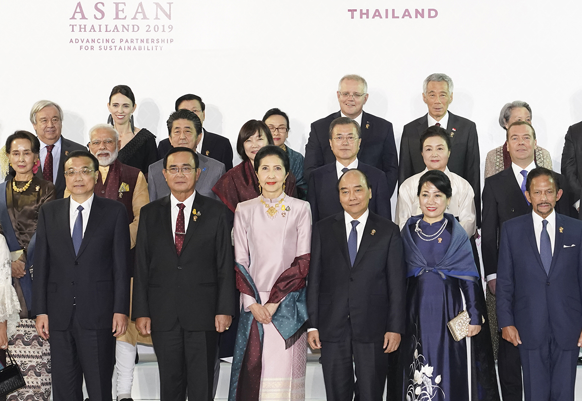 문재인 대통령과 김정숙 여사가 3일(현지시간) 태국 노보텔 방콕 임팩트에서 열린 아세안 관련 정상회의 갈라만찬에 참석해 아베 일본 총리 내외와 인사를 나누고 있다