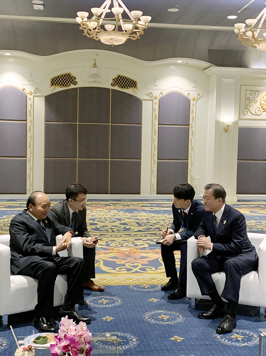 문재인 대통령과 응우엔 쑤언 푹 베트남 총리이 3일(현지시각) 오후 태국 방콕 IMPACT Challenger에서 열린 아세안 관련 정상회의 갈라만찬에 참석해 단체사진 촬영을 기다리던 중 대화하고 있다. 2019.11.03