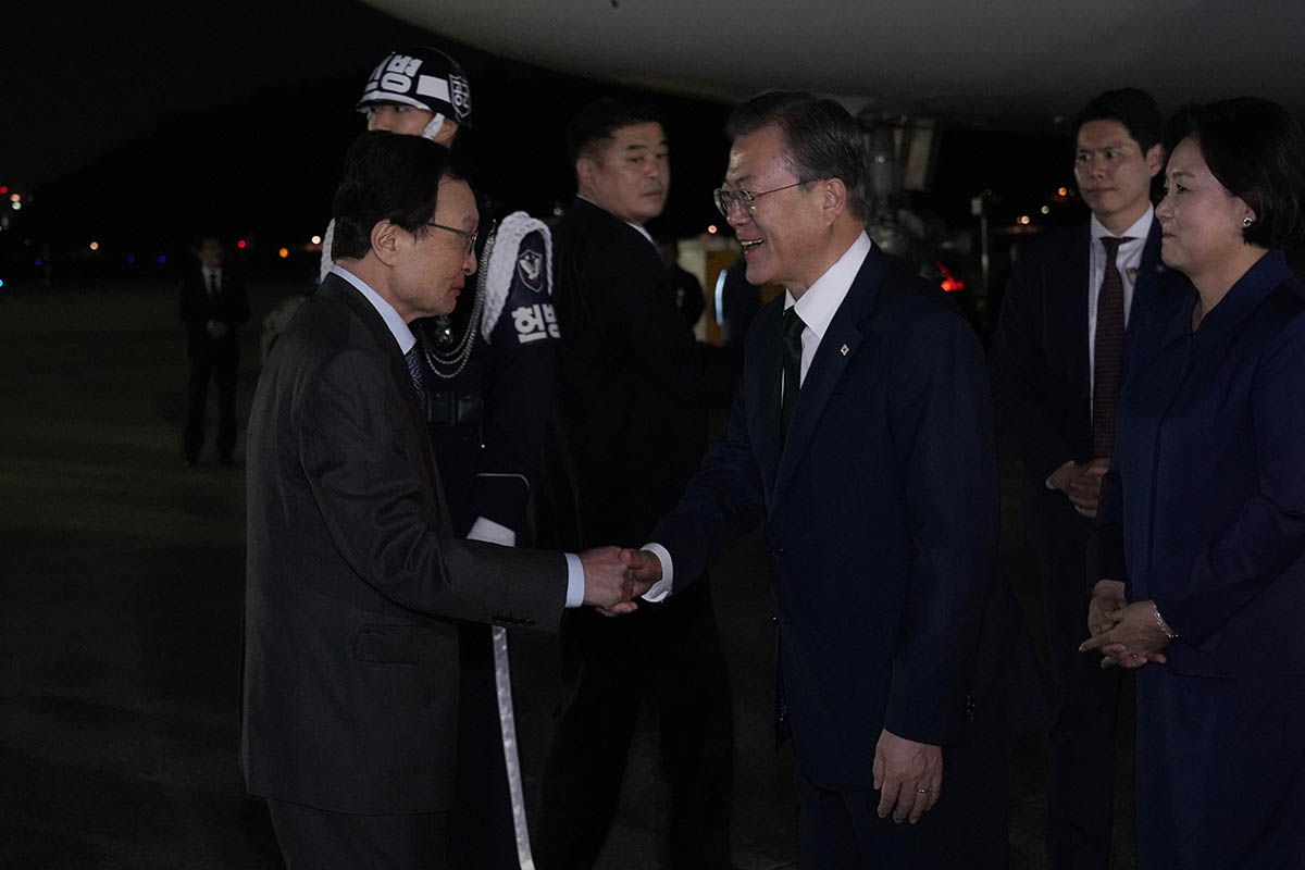 아세안 관련 정상회의를 마치고 귀국한 문재인 대통령과 김정숙 여사가 5일 오후 서울공항에 도착해 이해찬 더불어민주당 대표와 인사하고 있다. 2019.11.05