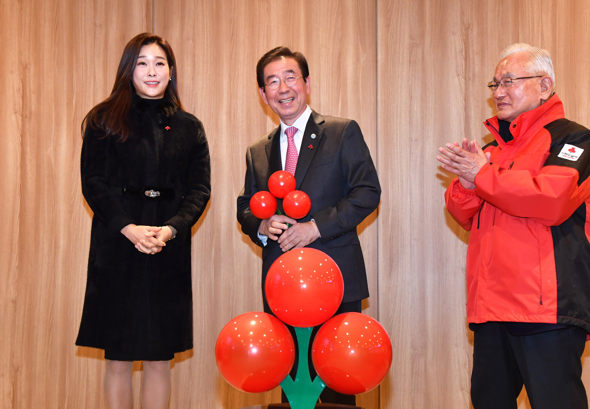 20일 희망2020나눔캠페인 출범식에 맞춰 이웃사랑 성금을 전달하는 박원순 서울시장(가운데)와 서울 사랑의열매 윤영석 회장(오른쪽)과 현영 홍보대사(왼쪽)가 함께 기념촬영을 하고 있다. 서울시 제공