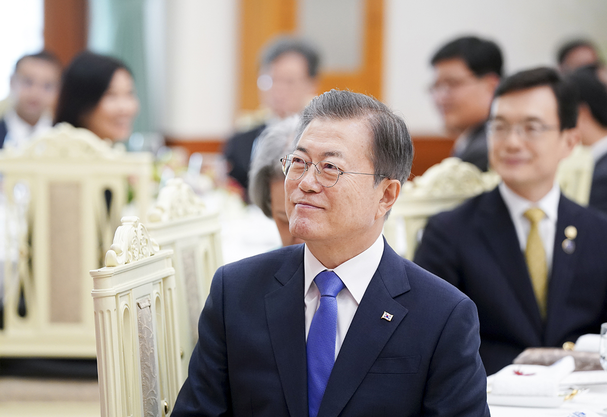 문재인 대통령이 23일 서울 종로구 청와대에서 열린 리센룽 싱가포르 총리 내외 공식방한 오찬에서 인사말을 듣고 있다