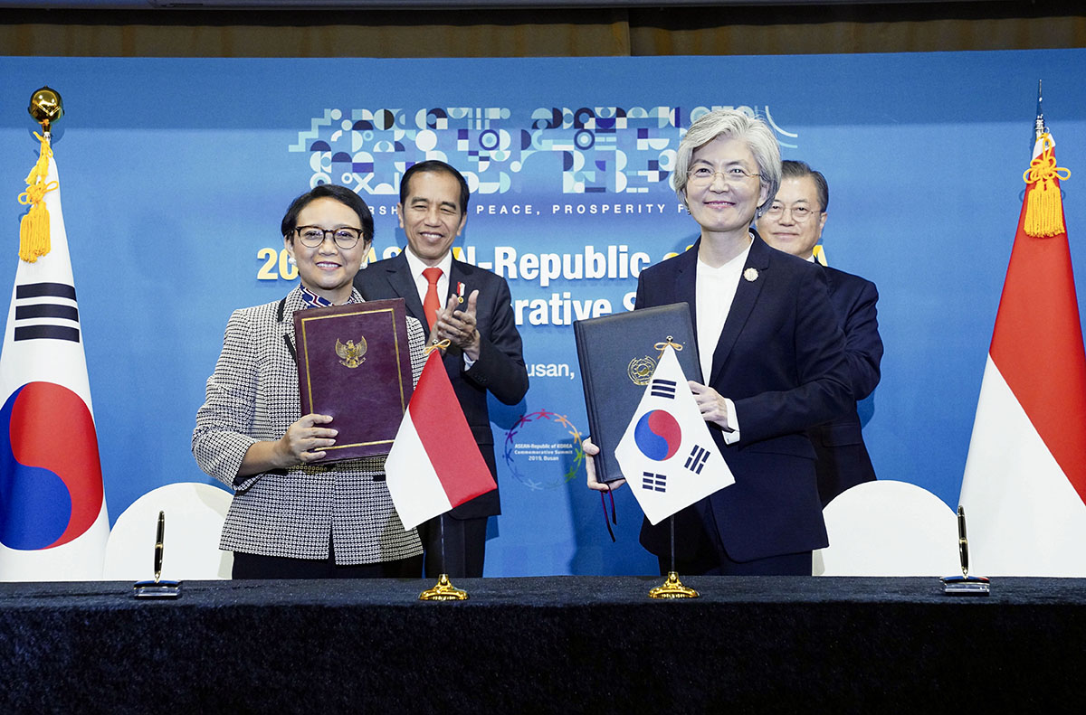 강경화 외교부 장관과 레트노 마르수디 인도네시아 외교부 장관이 25일 오후 부산 해운대 조선웨스틴호텔에서 협정서명식을 하고 있다.