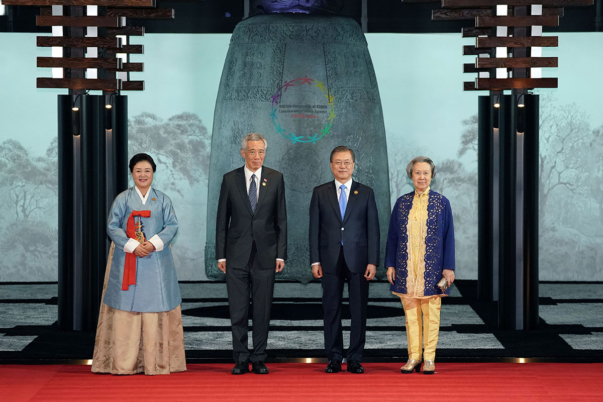문재인 대통령과 김정숙 여사가 25일 오후 부산 힐튼호텔에서 열린 2019 한-아세안 특별 정상회의 환영 만찬장 앞에서 리셴룽(李顯龍) 싱가포르 총리, 호 칭 싱가포르 총리 부인을 영접한 뒤 기념촬영을 하고 있다.