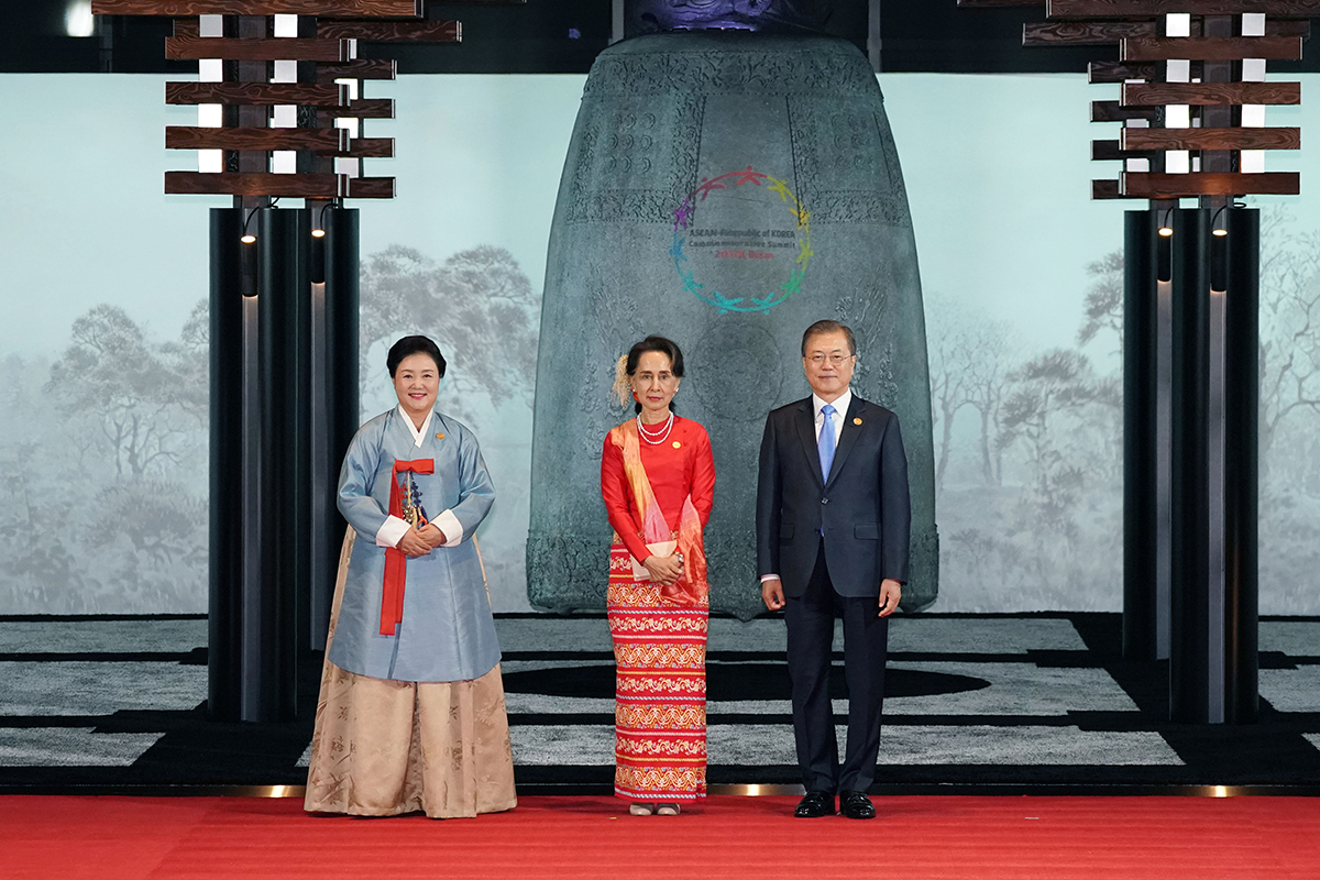 문재인 대통령과 김정숙 여사가 25일 오후 부산 힐튼호텔에서 열린 2019 한-아세안 특별 정상회의 환영 만찬장 앞에서 아웅산 수치 미얀마 국가고문을 영접한 뒤 기념촬영을 하고 있다.