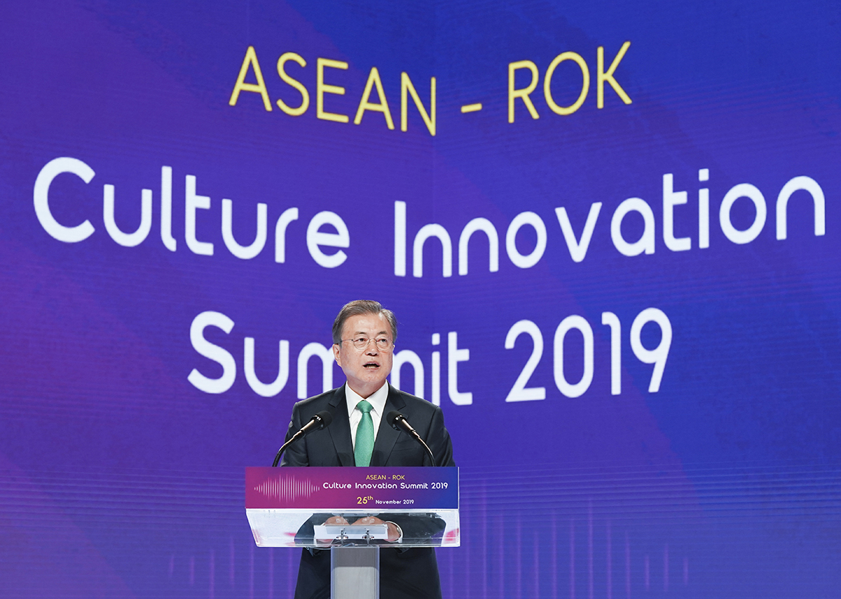 문재인 대통령이 25일 부산 벡스코 2전시장에서 열린 2019 한-아세안 특별 정상회의 '문화혁신포럼' 행사에서 환영사를 하고 있다.