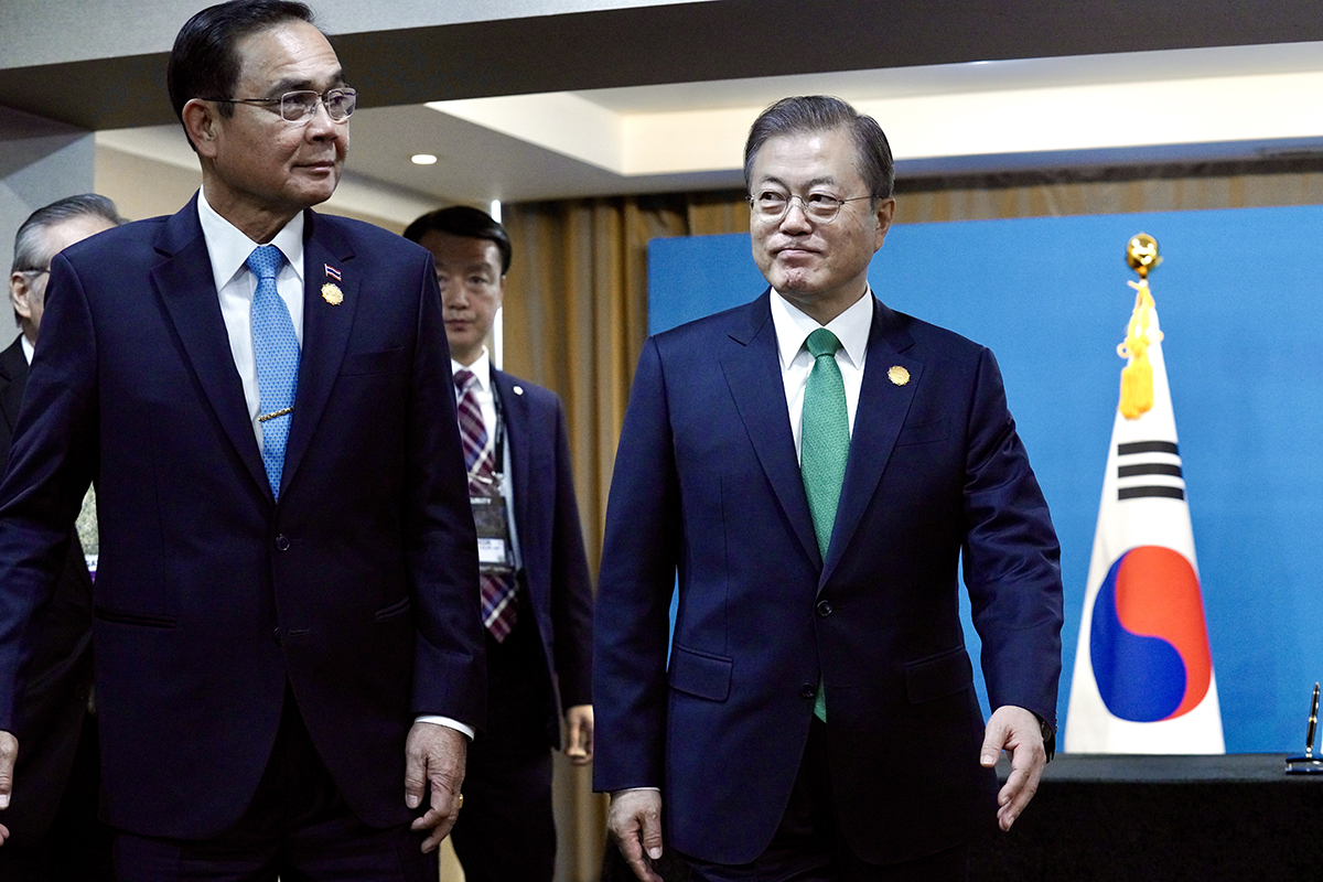 문재인 대통령과 쁘라윳 태국 총리가 25일 오전 부산 해운대 조선웨스틴호텔에서 양자회담을 위해 발걸음을 옮기고 있다.
