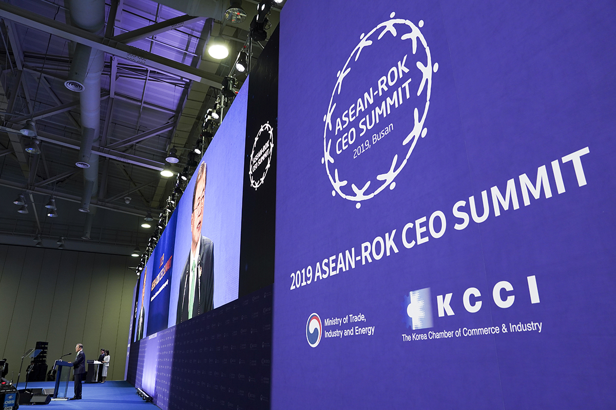 문재인 대통령이 25일 오전 부산 벡스코 2전시장에서 열린 2019 한-아세안 특별 정상회의 'CEO 서밋(Summit)'행사에서 기조연설을 하고 있다.