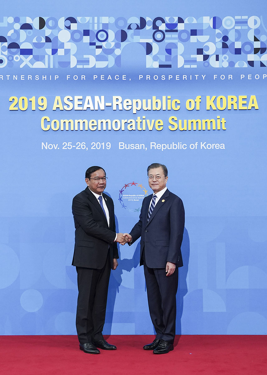 문재인 대통령이 26일 오전 부산 벡스코에서 열린 ‘2019 한-아세안 특별정상회의’ 개별영접에 참석해 프락 손혼 캄보디아 외교장관과 기념촬영을 하고 있다.