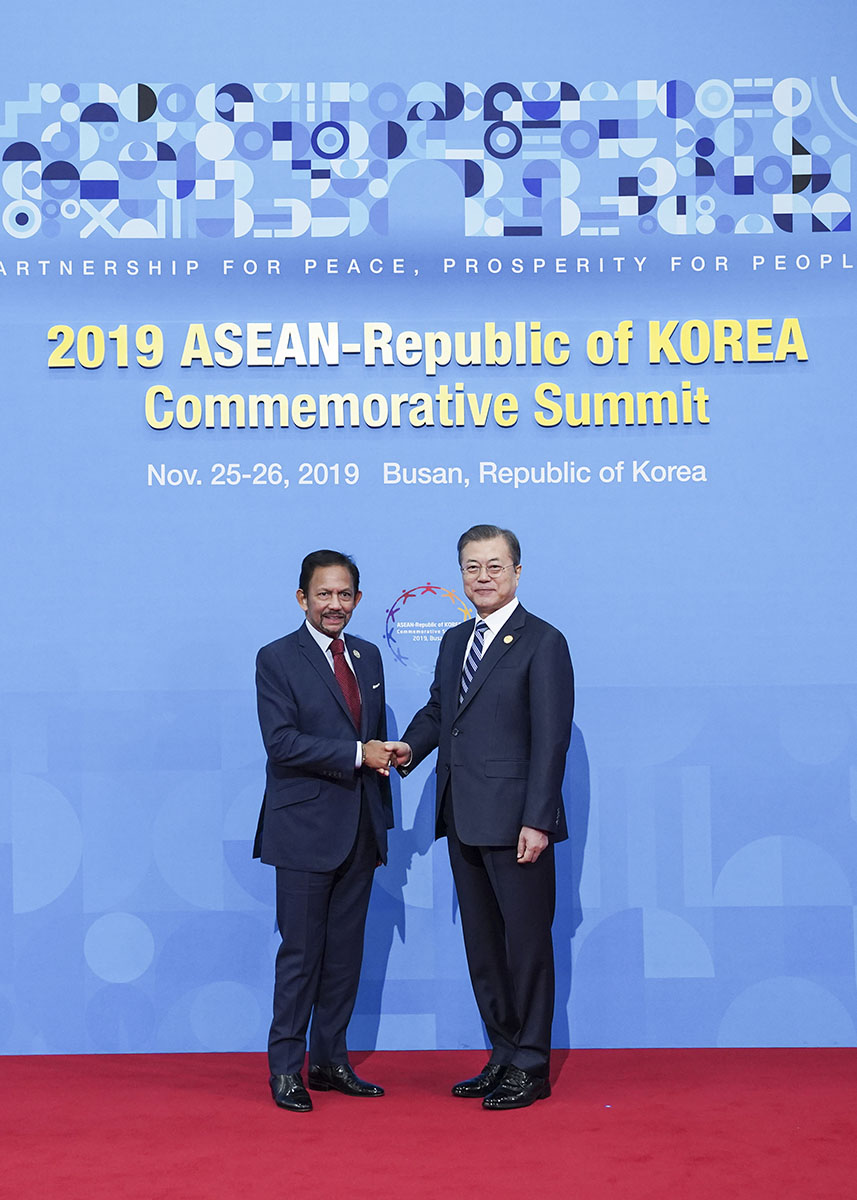문재인 대통령이 26일 오전 부산 벡스코에서 열린 ‘2019 한-아세안 특별정상회의’ 개별영접에 참석해 하싸날 볼키아 브루나이 국왕과 기념촬영을 하고 있다.