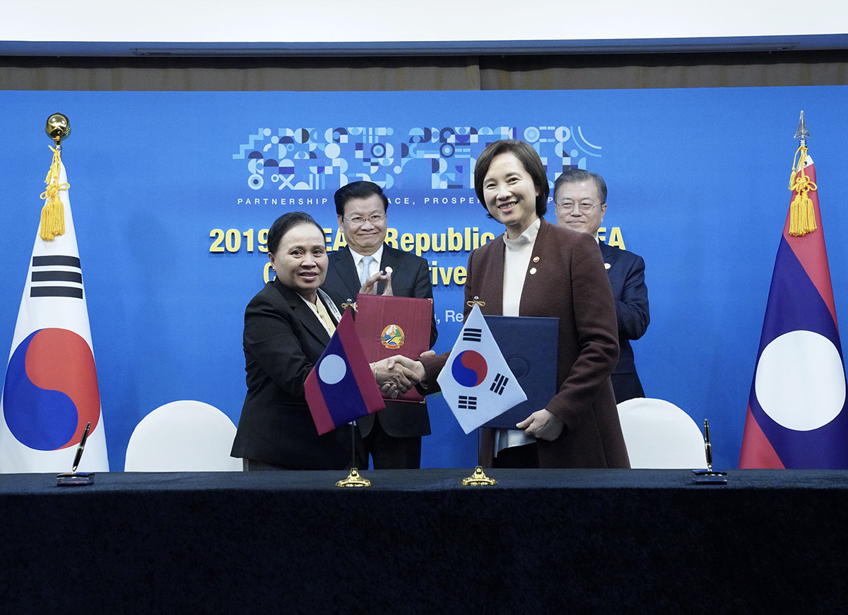 유은혜 교육부 장관과 칸탈리 시리퐁판 라오스인민민주공화국 교육체육부 차관이 26일 오후 부산 해운대 조선웨스틴호텔에서 직업교육협력 협정서명식을 하고 있다. 2019.11.26 사진 청와대제공