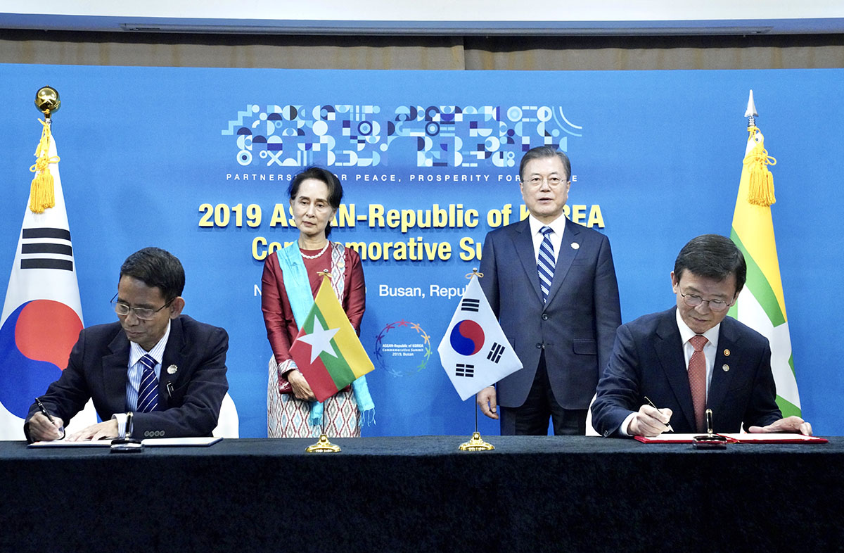 문성혁 해양수산부 장관과 아웅뚜 미얀마 농축산관개부장관이 26일 오후 부산 해운대 조선웨스틴호텔에서 수산협력 협정서명식을 하고 있다. 2019.11.26 사진 청와대제공