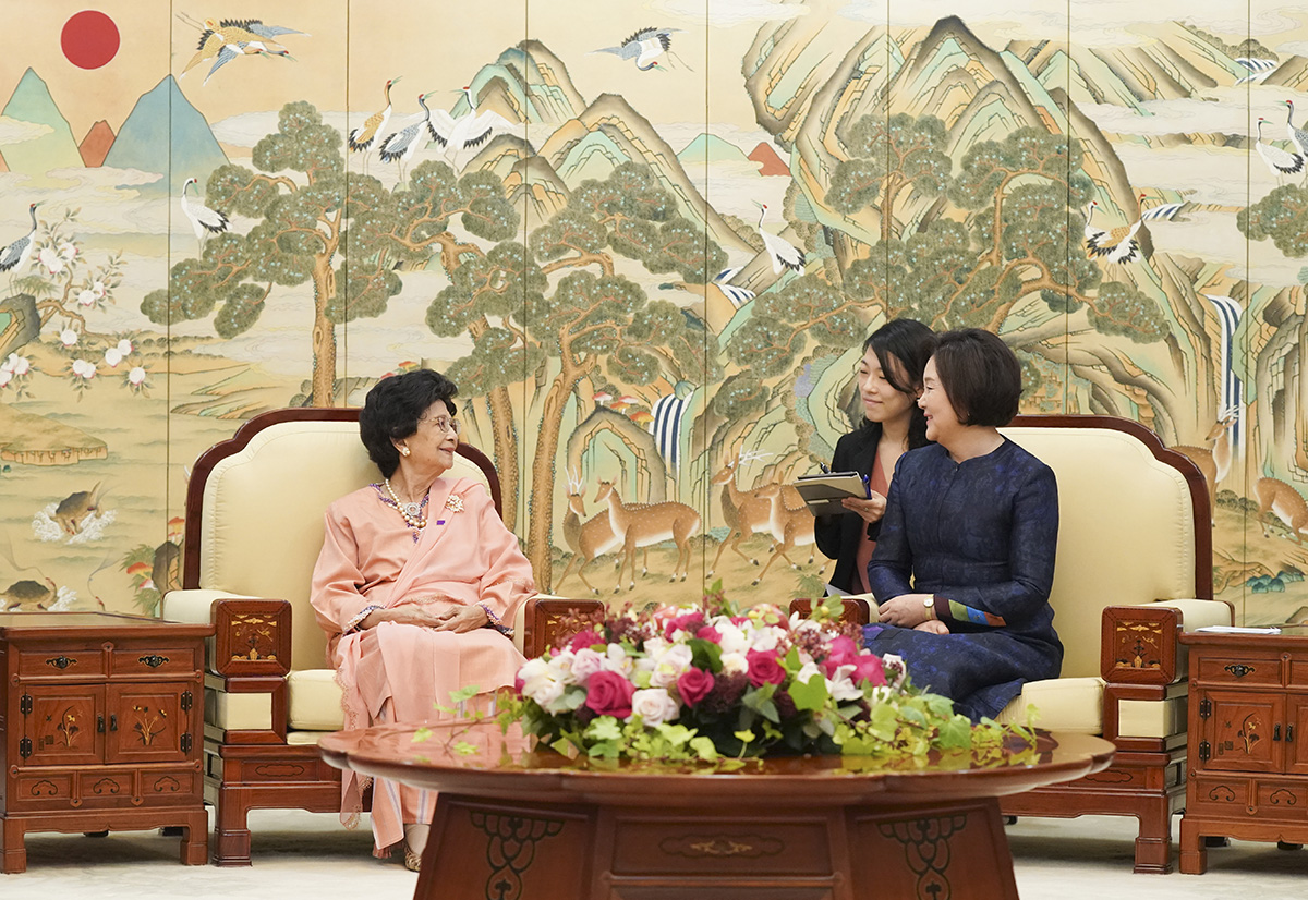 김정숙 여사와 말레이시아 총리 부인 시티 하스마 여사가 28일 청와대에서 대화를 나누고 있다.