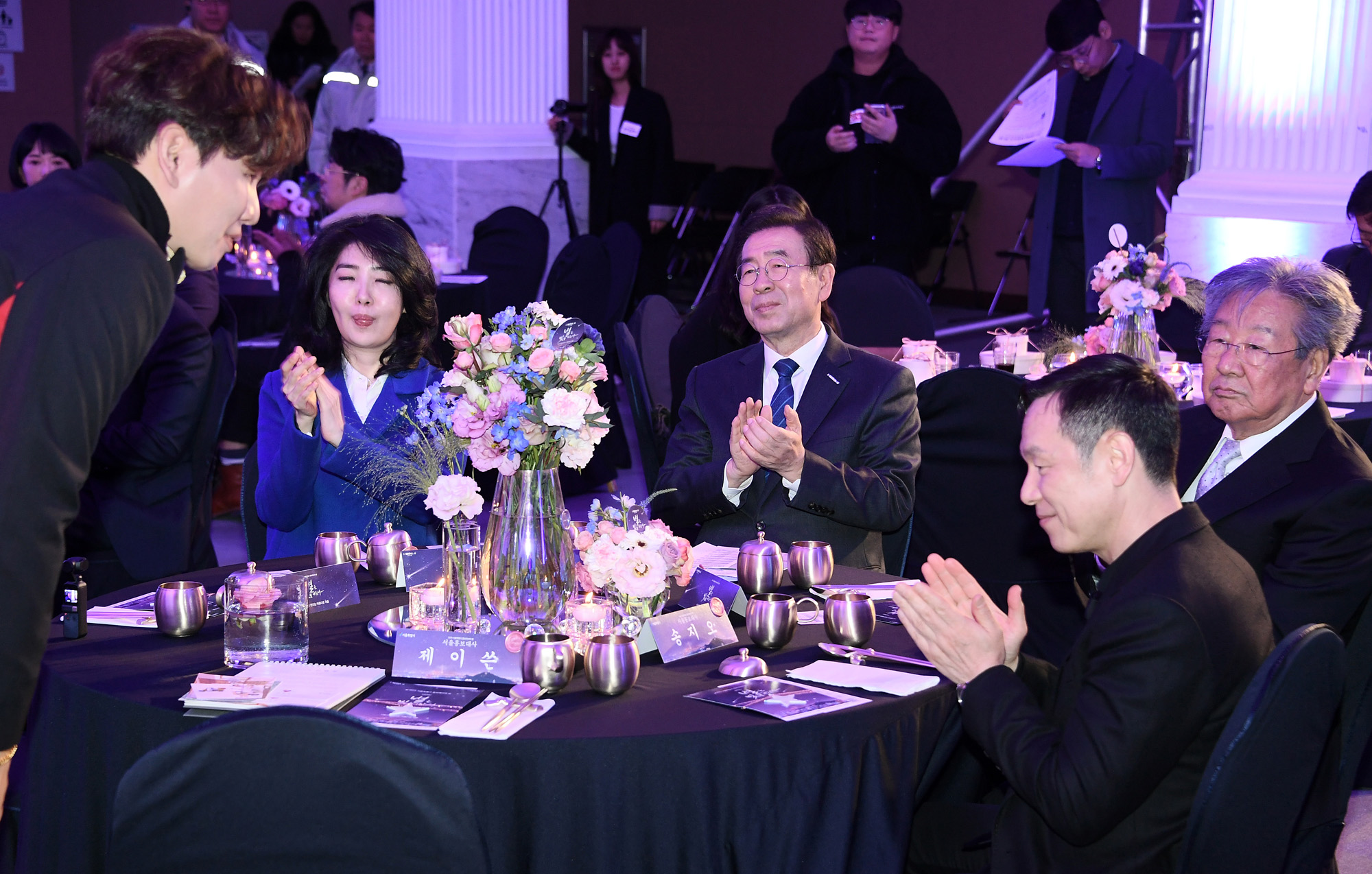 29일 오후 6시 서울시청 시민청에서 열린 2019 서울시 홍보대사의 밤 ‘별은 빛을 나눈다’에서 박원순 서울시장을 비롯 서울시 홍보대사 배우 최불암, 예능인 사유리, 탤런트 장현성, 멀티퍼커셔니스트 정건영 교수 등이 손가락 하트를 그리며 기념 촬영을 하고 있다. 서울시 제공