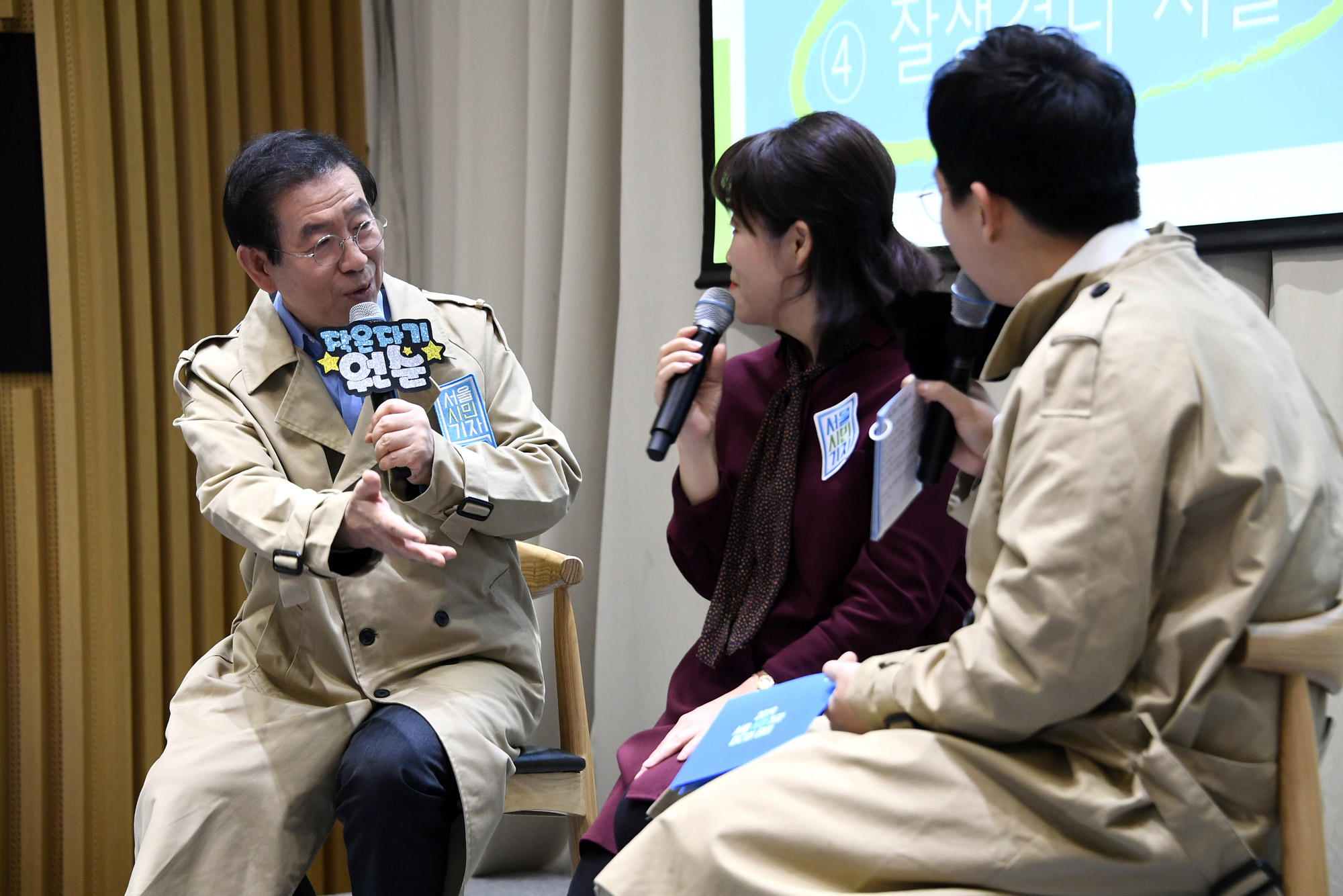 박원순 서울시장과 개그민 정범균이 30일 오전 서울시청 대회의실에서 열린 '2019 서울 시민기자 미디어데이'에서 시민기자와 인터뷰를 하고 있다. 서울시 제공