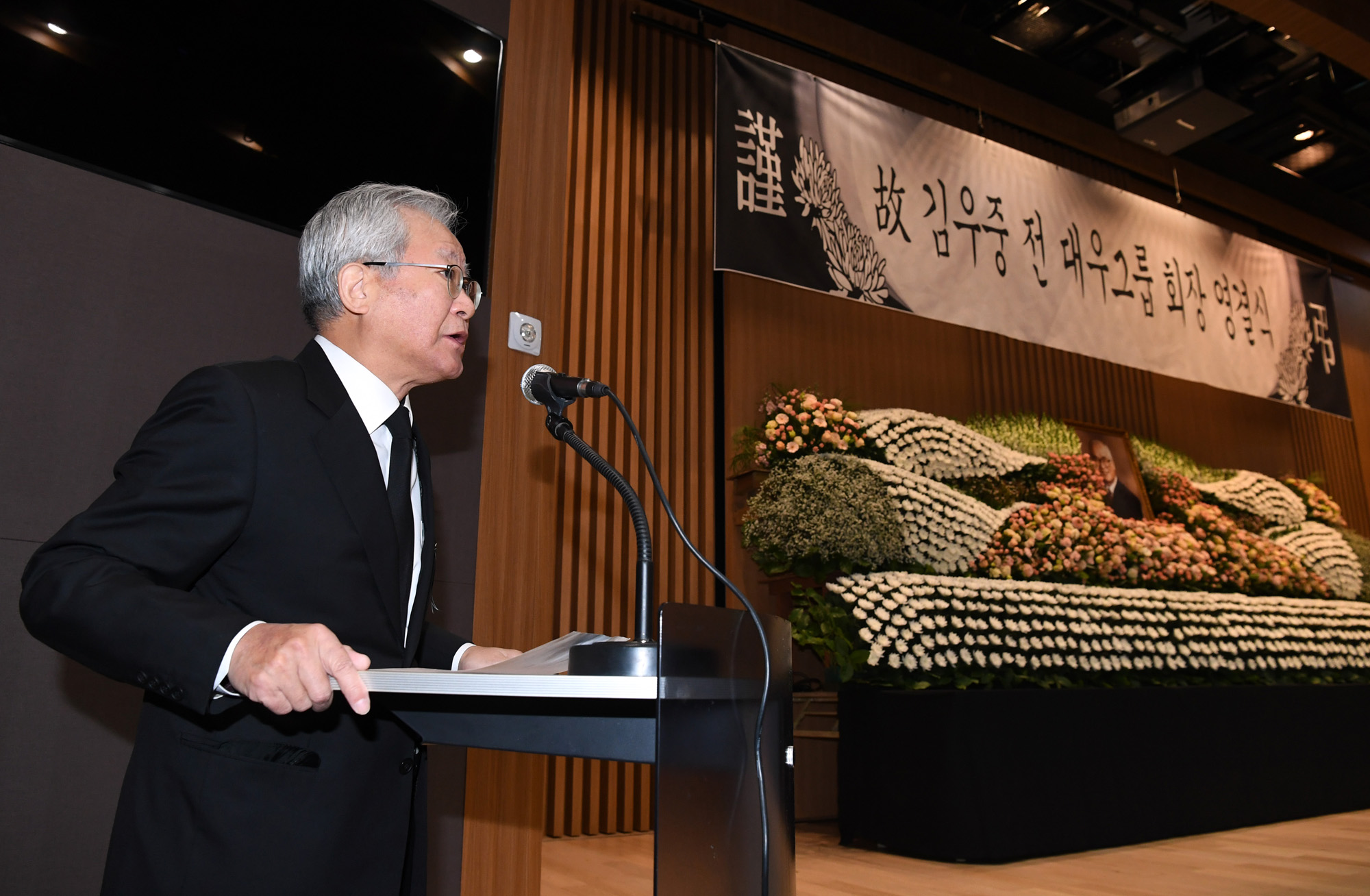 고 김우중 전 대우그룹 회장 영결식이 12일 오전 경기도 수원 아주대학교에서 거행된 가운데 장병주 대우세계연구회 회장이 조사를 하고 있다./2019.12.12 사진/임준선(현장풀)