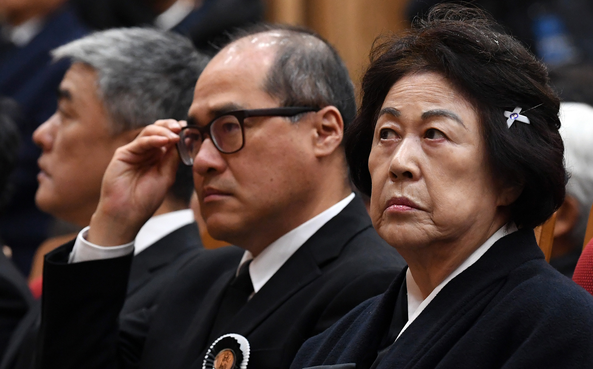고 김우중 전 대우그룹 회장 영결식이 12일 오전 경기도 수원 아주대학교에서 거행된 가운데 부인 정희자 여사와 장남 김선협씨가 고인의 생전 영상을 보고 있다./2019.12.12 사진/임준선(현장풀)