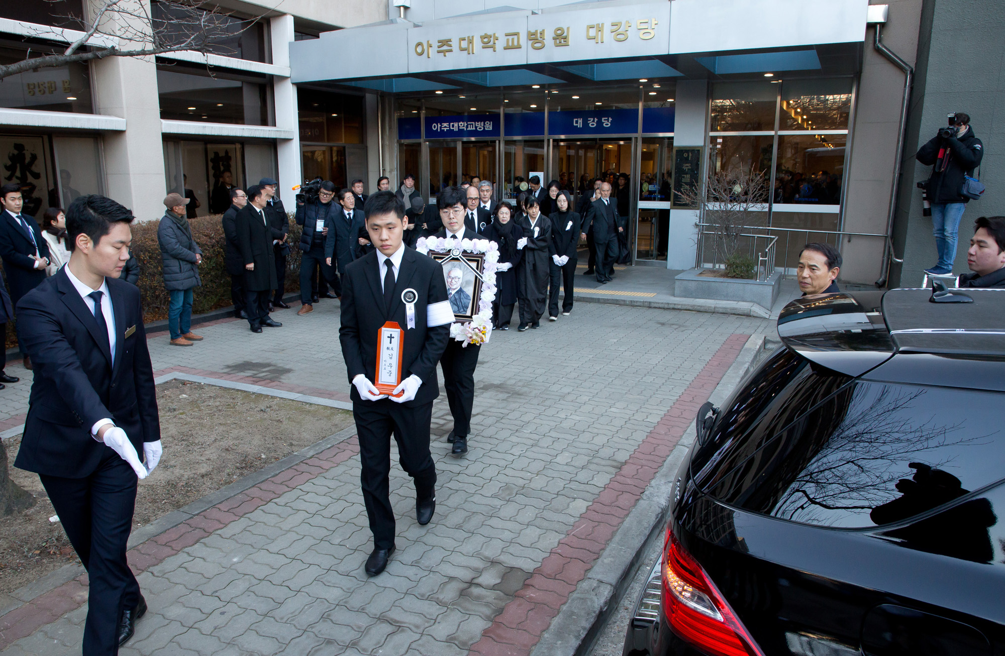 [eoimage=수원] 임준선 기자 = 故 김우중 전 대우그룹 회장의 발인이 엄수된 12일 오전 경기 수원시 아주대병원 별관 대강당에서 고인의 영정을 든 유족들이 운구차량으로 향하고 있다. 2019.12. 12 .eomaster@eoimage.com