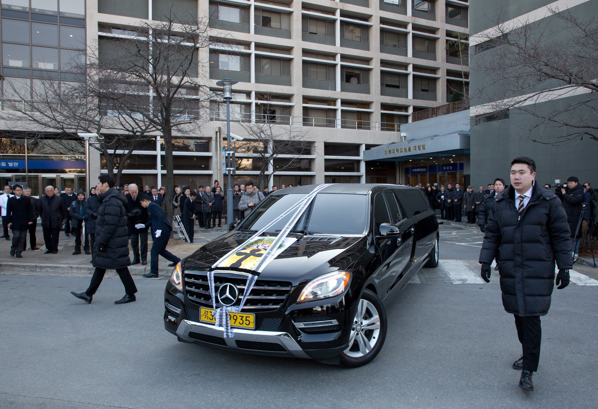 [eoimage=수원] 임준선 기자 = 故 김우중 전 대우그룹 회장의 발인이 엄수된 12일 오전 경기 수원시 아주대병원 별관 대강당에서 고인의 운구차량이 출발 준비를 하고 있다. 2019.12. 12 .eomaster@eoimage.com