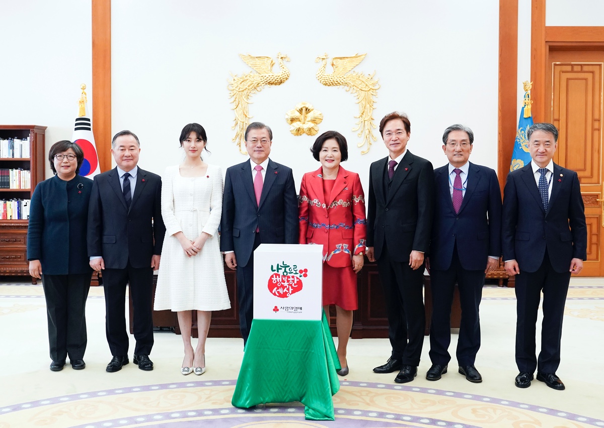 문재인 대통령과 김정숙 여사가 20일 청와대에서 사랑의 열매 성금 전달 후 기념촬영을 하고 있다. 왼쪽부터 김연순 사회복지공동모금회 사무총장, 예종석 사회복지공동모금회 회장, 아너소사이어티 회원인 가수 겸 배우 수지, 문재인 대통령, 김정숙 여사, 아너소사이어티 회원인 배우 정보석, 노영민 비서실장, 박능후 보건복지부 장관. 2019.12.20 사진 청와대제공 |