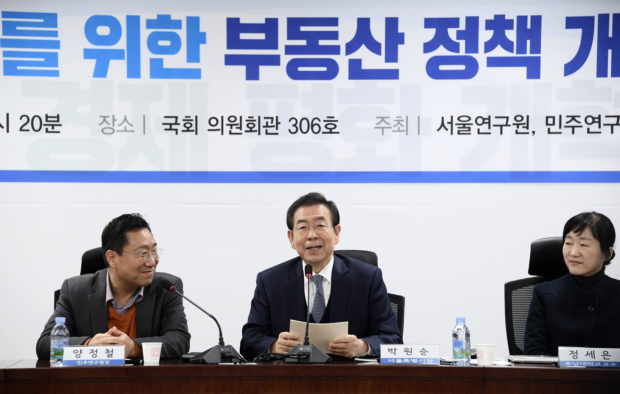 박원순 서울시장이 17일 오전 서울 여의도 국회 의원회관에서 열린 불평등 해소를 위한 부동산정책 개선방안 토론회에서 모두발언을 하고 있다. 서울시 제공