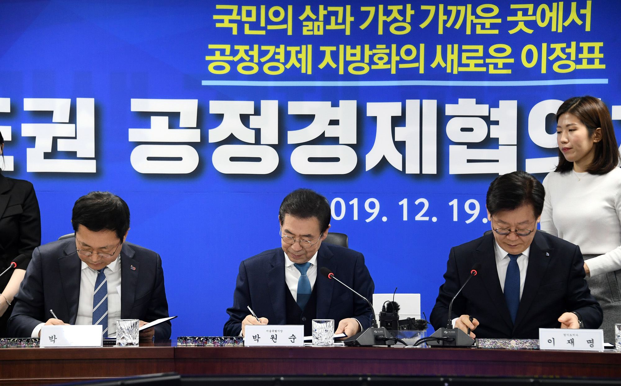 박원순 서울시장, 박남춘 인천광역시장, 이재명 경기도지사를 비롯한 참석자들이 19일 오전 서울 여의도 국회 의원회관에서 열린 수도권 공정경제협의체 발족식 및 업무협약식에서 기념촬영하고 있다. 서울시 제공