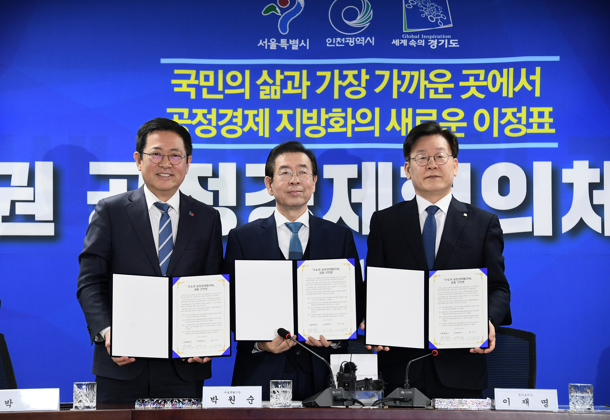 박원순 서울시장, 박남춘 인천광역시장, 이재명 경기도지사를 비롯한 참석자들이 19일 오전 서울 여의도 국회 의원회관에서 열린 수도권 공정경제협의체 발족식 및 업무협약식에서 기념촬영하고 있다. 서울시 제공