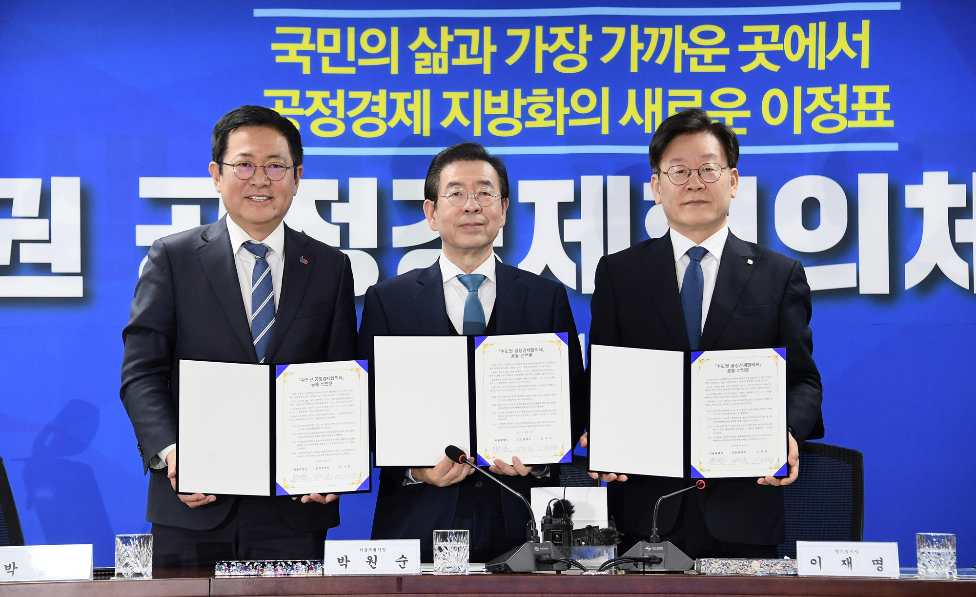 박원순 서울시장, 박남춘 인천광역시장, 이재명 경기도지사를 비롯한 참석자들이 19일 오전 서울 여의도 국회 의원회관에서 열린 수도권 공정경제협의체 발족식 및 업무협약식에서 기념촬영하고 있다. 서울시 제공