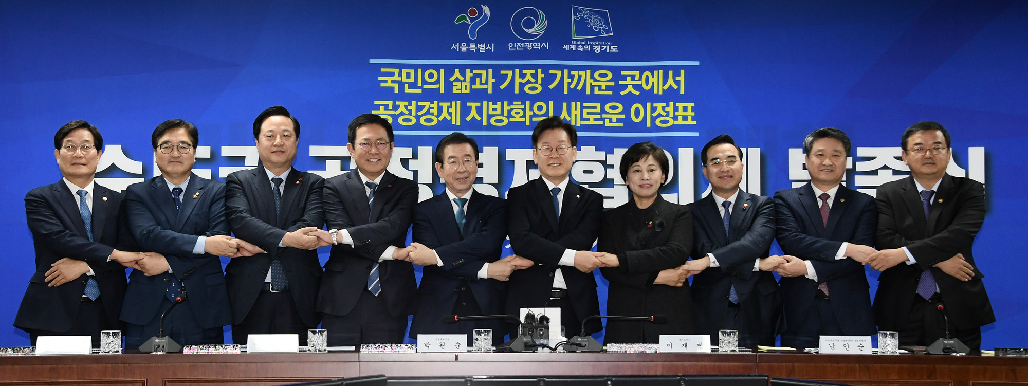 박원순 서울시장, 박남춘 인천광역시장, 이재명 경기도지사를 비롯한 참석자들이 19일 오전 서울 여의도 국회 의원회관에서 열린 수도권 공정경제협의체 발족식 및 업무협약식에서 기념촬영하고 있다. 서울시 제공