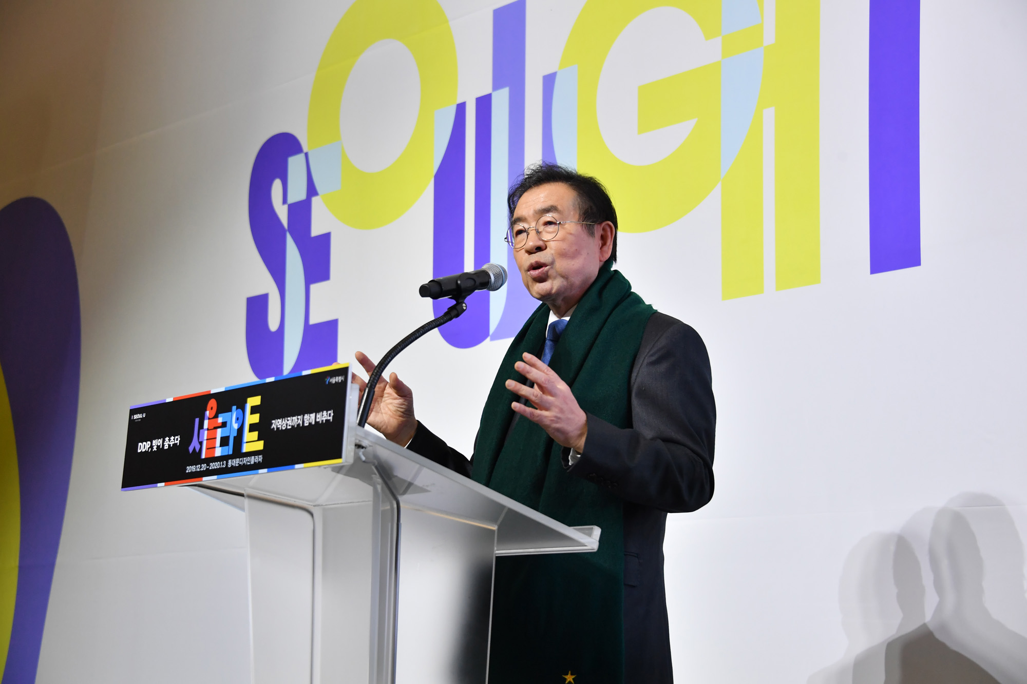 박원순 서울시장이 20일 오후 서울 중구 동대문디자인플라자(DDP)에서 열린 대형 라이트쇼 ‘서울라이트(SEOULIGHT)' 개막식에서 인사말을 하고 있다. 서울시 제공