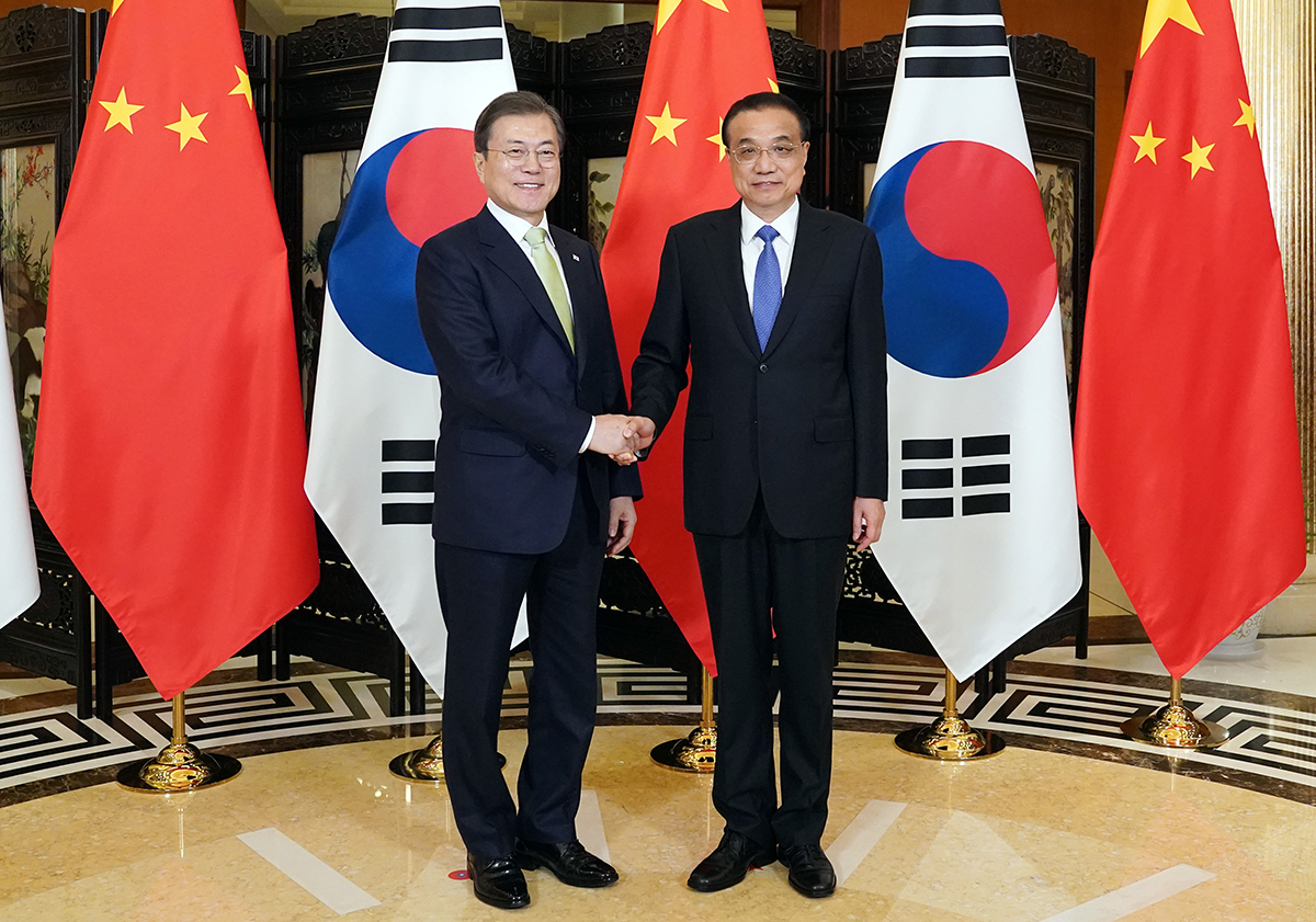 문재인 대통령이 23일 중국 청두 진장호텔에서 열린 회담에 앞서 리커창 총리와 인사를 나누고 있다.