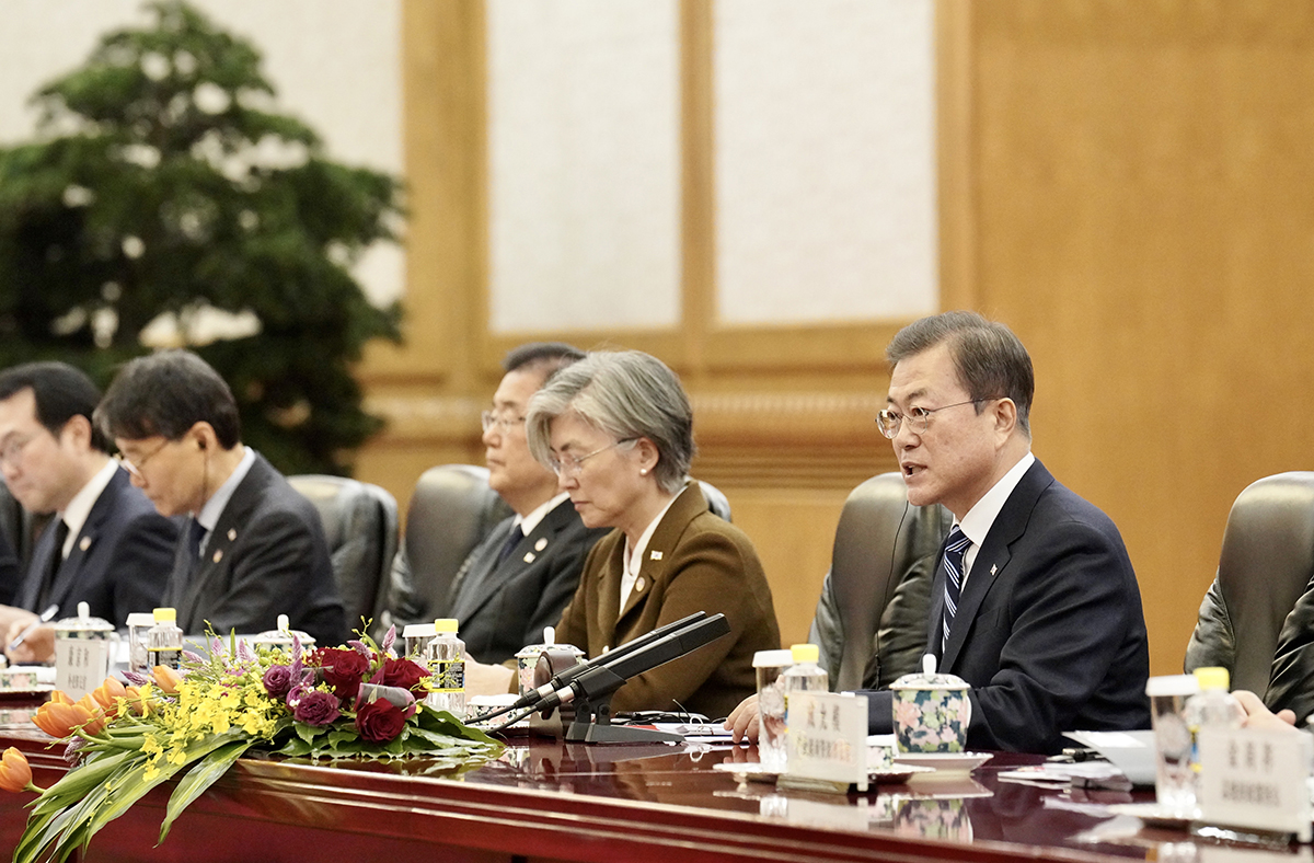 문재인 대통령이 23일 중국 베이징 인민대회당에서 시진핑 중국 국가주석과 정상회담을 하고 있다.