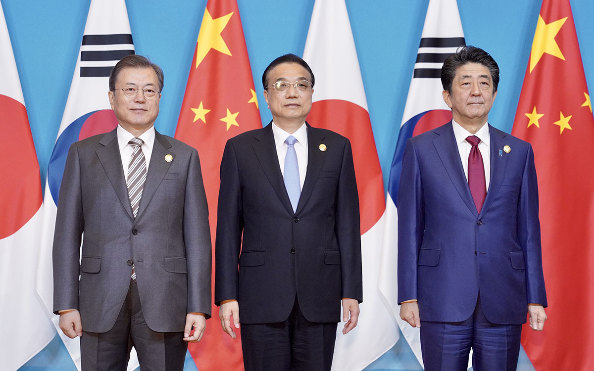 문재인 대통령과 아베 일본 총리, 리커창 중국 총리가 24일 쓰촨성 청두 세기성 국제회의센터에서 3국 정상회의에 앞서 기념촬영을 하고 있다.