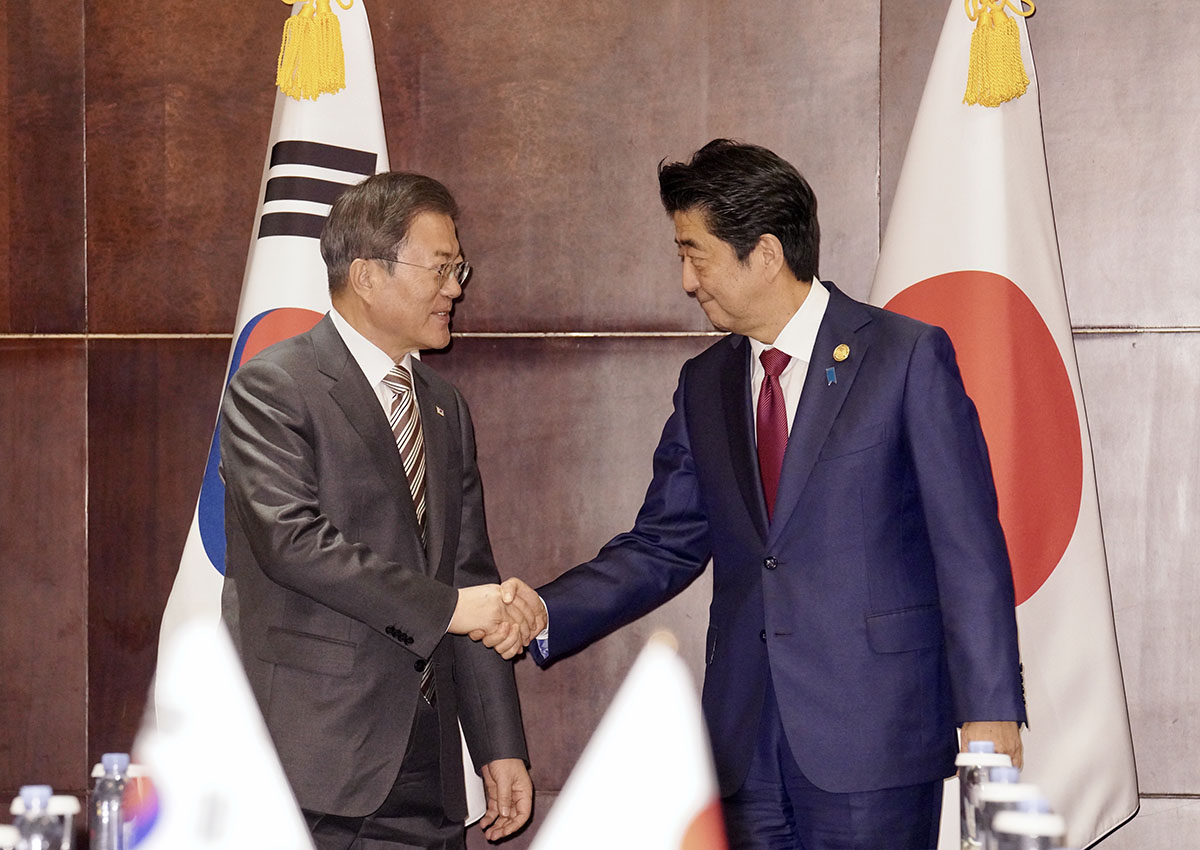 문재인 대통령과 아베 신조 일본 총리가 24일 중국 쓰촨성 청두 샹그릴라 호텔에서 열린 한일 정상회담에 앞서 악수하고 있다.