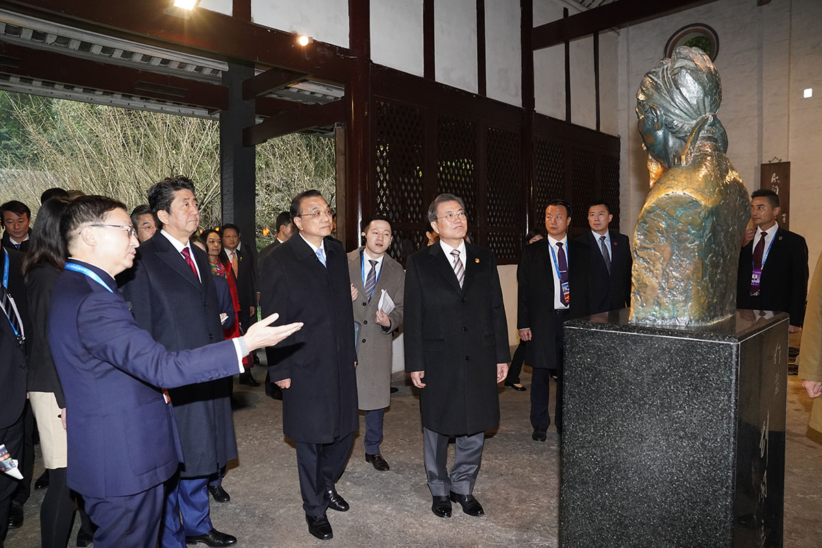 문재인 대통령과 리커창 중국 국무원 총리가 24일 중국 쓰촨성 청두 두보초당에서 한중일 협력 20주년 기념 제막식에 앞서 두보초당을 둘러보고 있다. 두보초당은 중국의 시인 두보가 거주했던 곳이다.