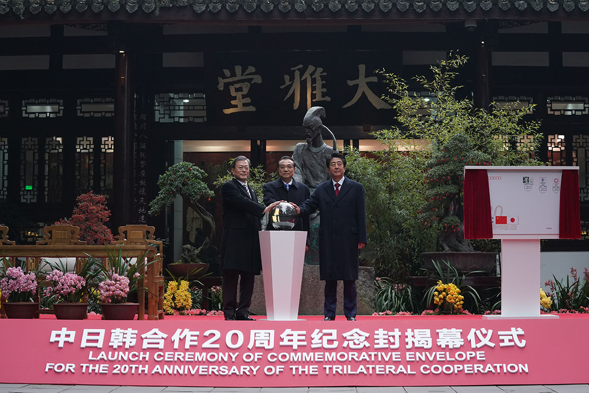 문재인 대통령과 리커창 중국 국무원 총리, 아베 신조 일본 총리가 24일 중국 쓰촨성 청두 두보초당에서 한중일 협력 20주년 기념 제막식을 하고 있다. 두보초당은 중국의 시인 두보가 거주했던 곳이다.