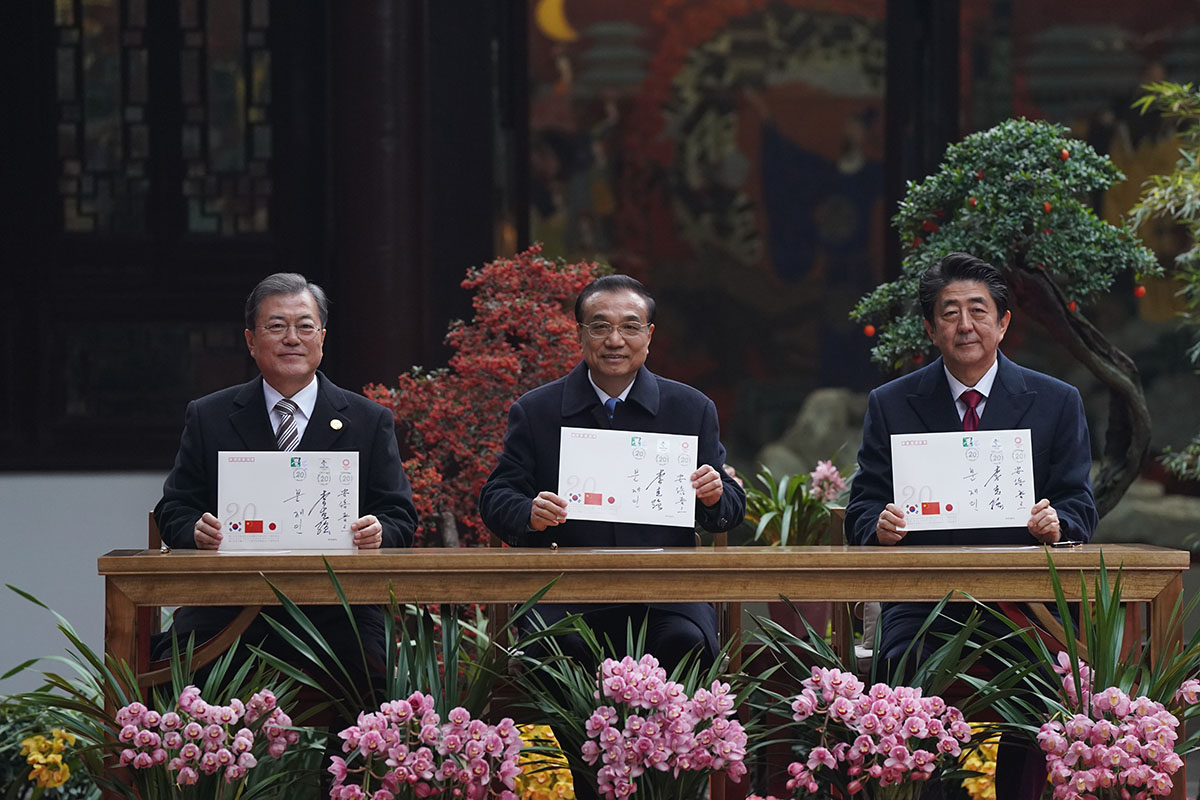 문재인 대통령과 리커창 중국 국무원 총리, 아베 신조 일본 총리가 24일 중국 쓰촨성 청두 두보초당에서 한중일 협력 20주년 기념 봉투에 서명한 뒤 들어보이고 있다. 두보초당은 중국의 시인 두보가 거주했던 곳이다.