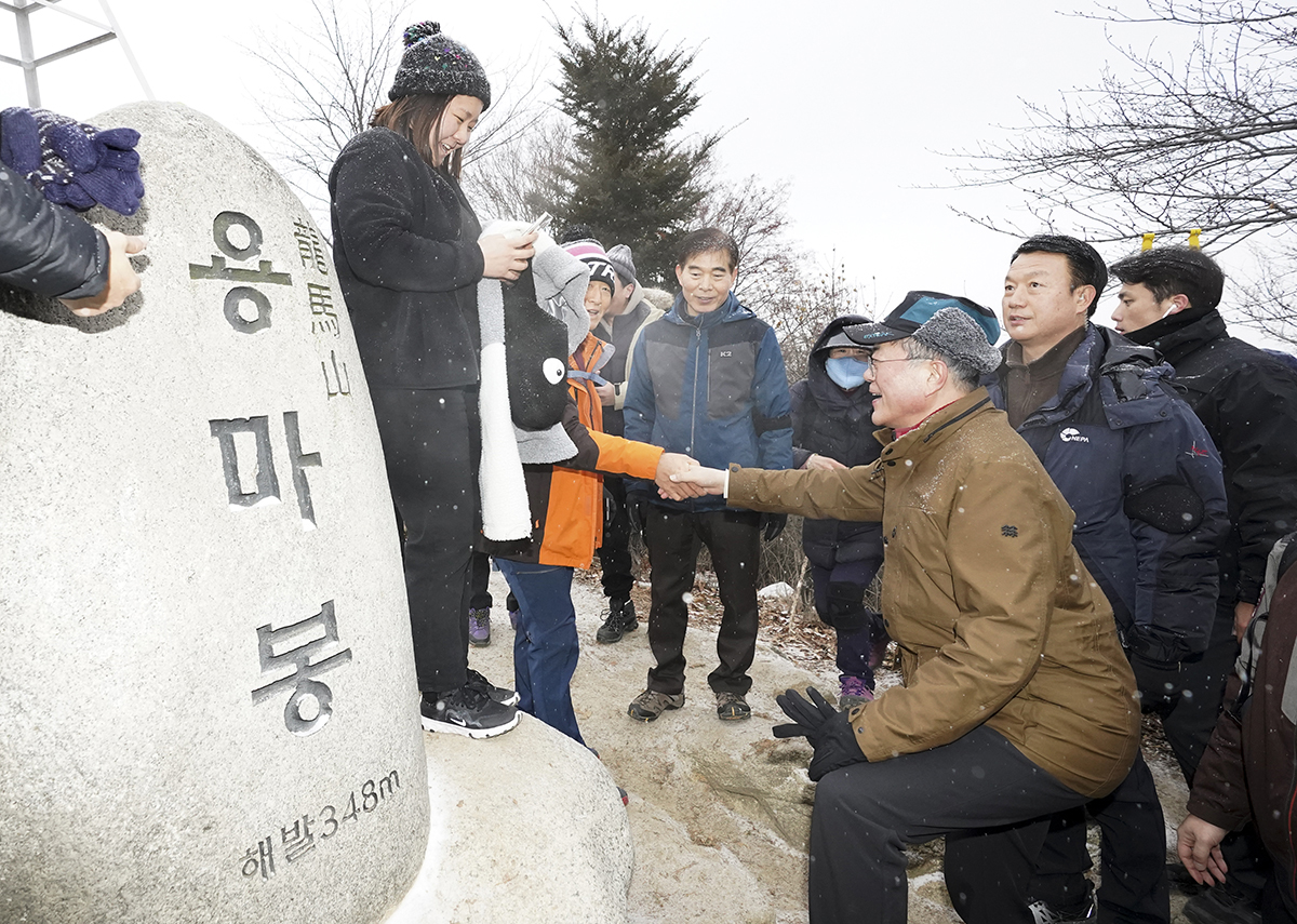 문재인 대통령이 2020년 새해 첫날인 1일 오전 경기도 구리시 아차산에서 2019년 한해를 빛낸 7명의 의인(義人)들과 함께 해맞이 산행을 하며 시민들과 새해 인사를 하고 있다.