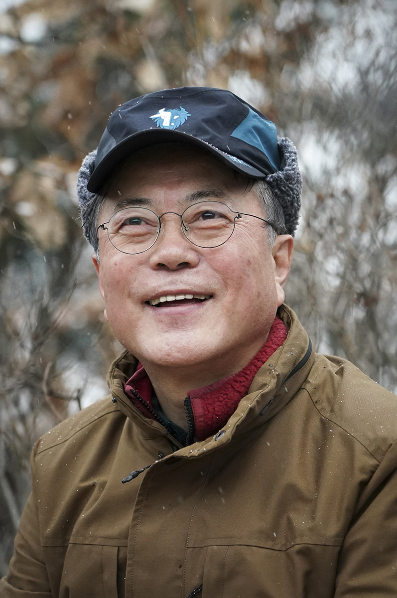 문재인 대통령이 2020년 새해 첫날인 1일 오전 경기도 구리시 아차산에서 2019년 한해를 빛낸 7명의 의인(義人)들과 함께 해맞이 산행을 하고 있다.