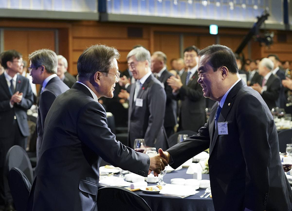 문재인 대통령과 문희상 국회의장이 2일 오전 서울 중구 대한상공회의소 국제회의장에서 열린 신년 합동 신년회에서 악수하고 있다.