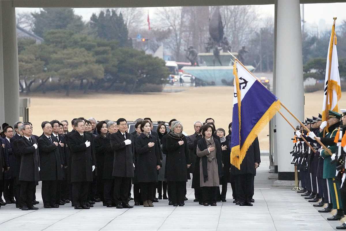 문재인 대통령과 국무위원들이 2일 오전 서울 동작구 국립서울현충원을 참배하기 위해 현충원에 들어서며 국기에 대한 경례를 하고 있다.