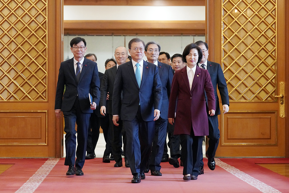 문재인 대통령이 2일 청와대 본관에서 추미애 신임 법무부 장관에게 임명장을 수여한 후 함께 환담장으로 이동하고 있다.