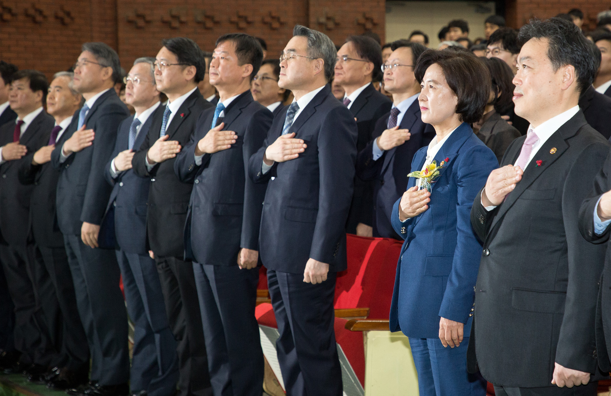 | 사진설명 | [Eoimage=서울] 임준선기자 = 추미애 신임 법무부 장관이 3일 오전 경기도 과천정부청사 법무부에서 열린 취임식에 참석해 국민의례를 하고 있다. 추 장관은 취임 일성으로 "검찰개혁에 대한 국민적 요구와 지지는 역대 최고조"라며 "이제는 검찰 안에서도 변화와 개혁을 향한 목소리가 나와야 한다"고 밝혔다 2020.01.03 eomaster@eoimage.com |