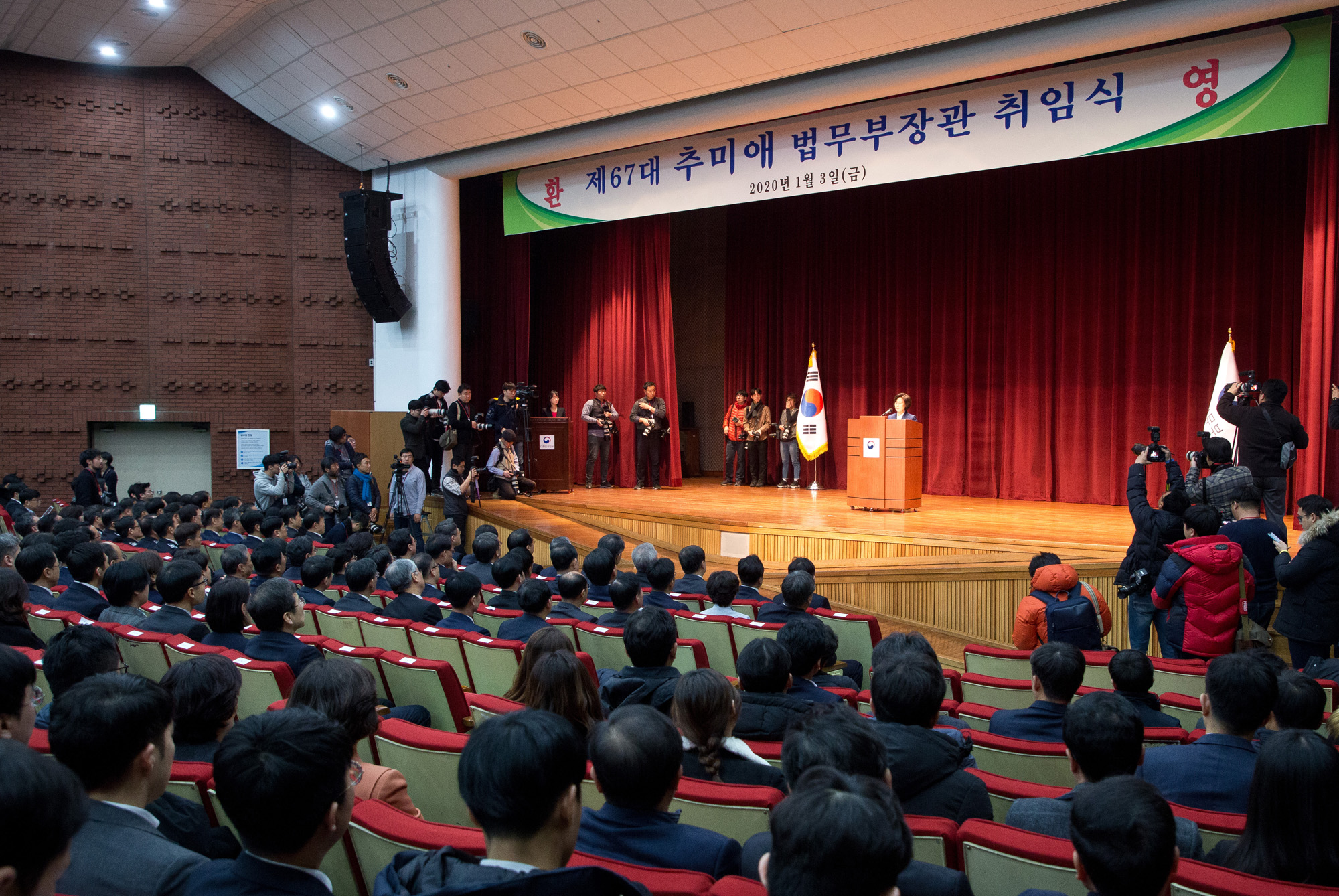 | 사진설명 | [Eoimage=서울] 임준선기자 = 추미애 신임 법무부 장관이 3일 오전 경기도 과천정부청사 법무부에서 열린 취임식에 참석해 취임사를 하고 있다. 추 장관은 취임 일성으로 "검찰개혁에 대한 국민적 요구와 지지는 역대 최고조"라며 "이제는 검찰 안에서도 변화와 개혁을 향한 목소리가 나와야 한다"고 밝혔다. 2020.01.03 eomaster@eoimage.com |