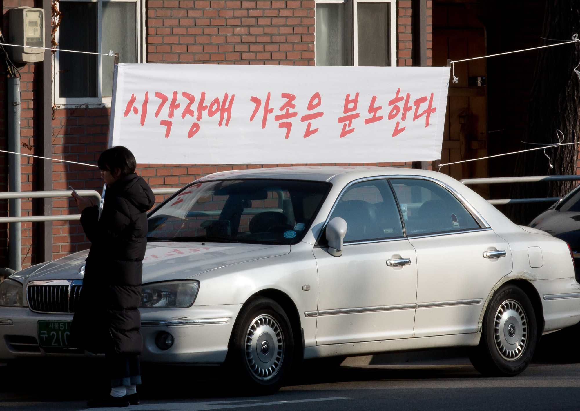 | 사진설명 | [Eoimage=서울] 임준선기자 = 맹학교 학부모들과 시각 장애인들이 4일 오후 서울 종로구 경복궁역 인근에서 보수집회 행진 때 시각장애인의 학습권 및 주민 안정권 확보를 촉구하는 현수막 집회를 하고 있다. 2020.01.04 eomaster@eoimage.com |