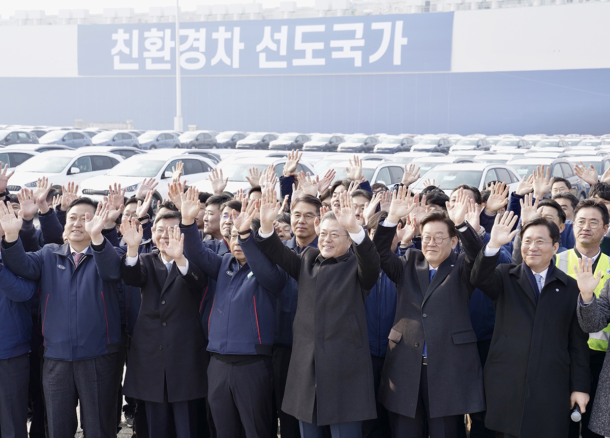 문재인 대통령이 3일 오전 경기도 평택시 평택항에서 진행된 올해 첫 친환경차 수출현장에서 참석자들과 기념촬영을 하고 있다.