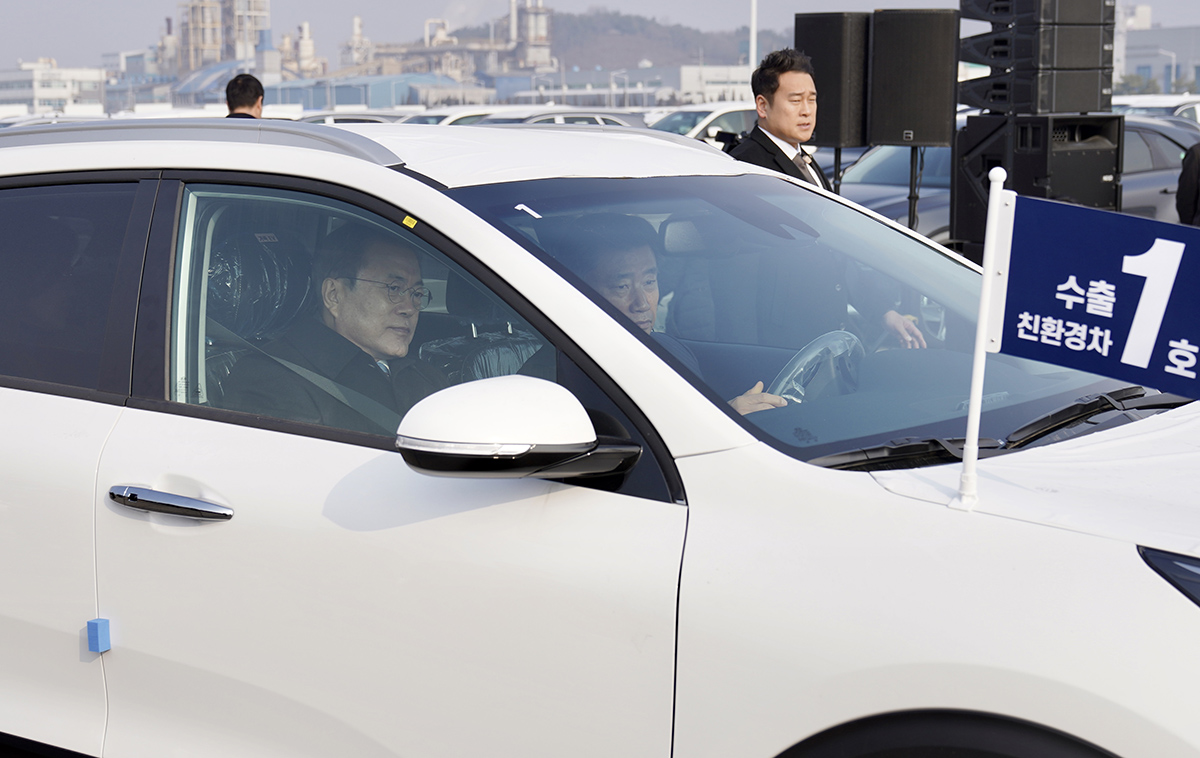 문재인 대통령이 3일 경기도 평택항에서 올해 첫 친환경차 수출 1호 니로 차량에 탑승하고 있다.