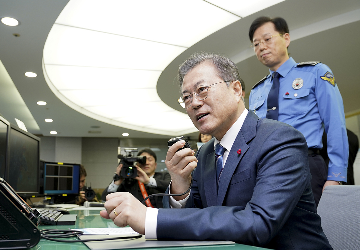 문재인 대통령이 3일 오전 경기도 평택항 마린센터를 방문, 해상교통관제센터에서 직원을 격려하고 있다