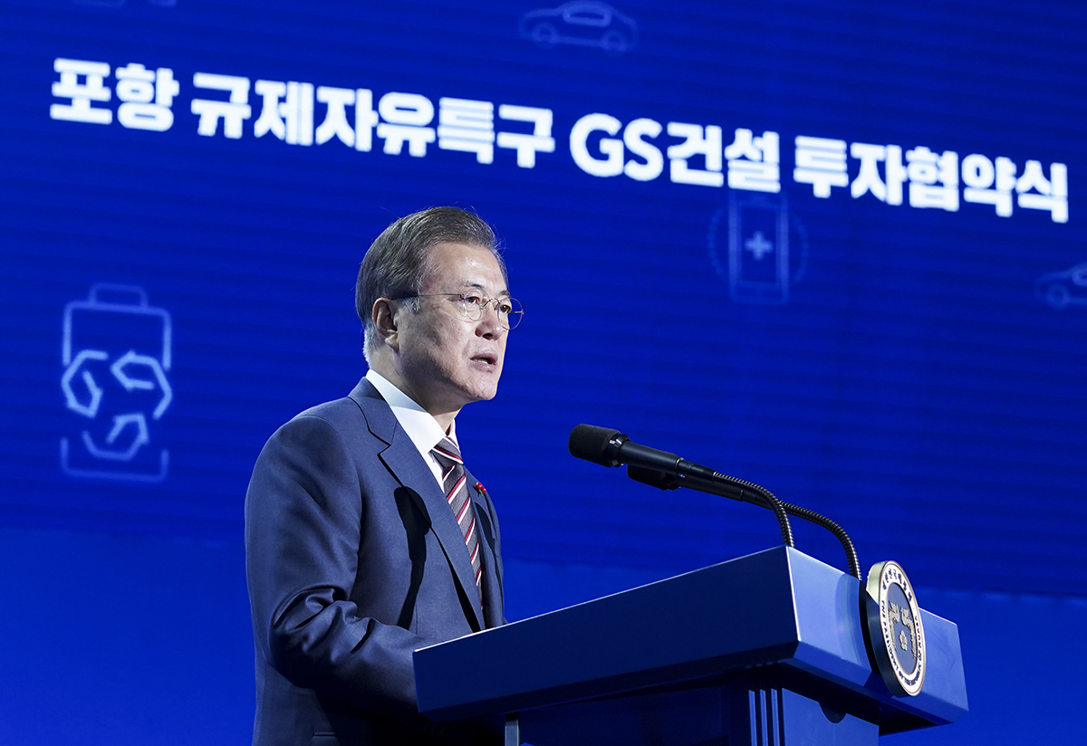 문재인 대통령이 9일 경북 포항시 남구 포항실내체욱관에서 열린 포항 규제자유특구 GS건설 투자 협약식에서 업무협약을 축하하고 있다
