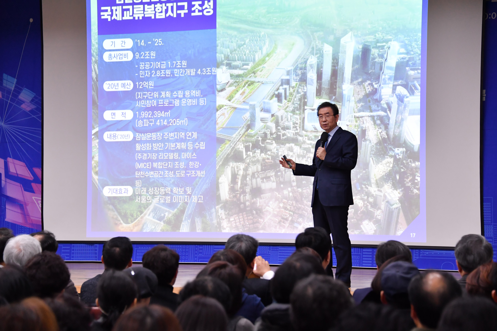30일 오전 서울 송파구청 대강당에서 열린 ‘서울시장과 함께하는 송파구 2020 예산설명회’에서 박성수 구청장과 박원순 서울시장이 지역에서 추진하는 사업에 대해 의견를 나누고 있다. 서울시 제공
