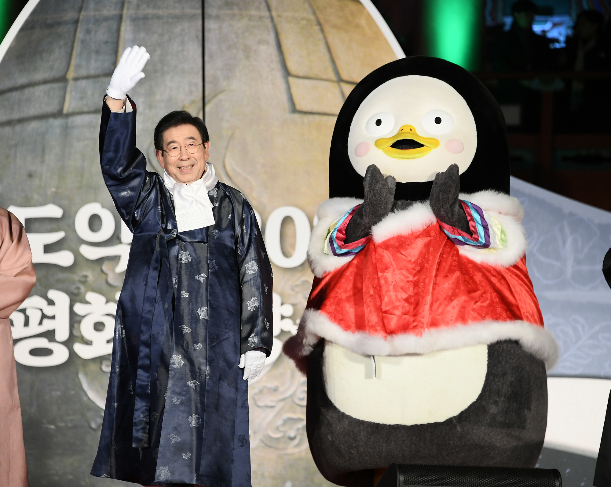 31일 자정 서울 종로 보신각 앞에서 2019년 제야의 종 타종에 나선 박원순 서울시장(가운데)과 야구선수 류현진(왼쪽 여섯째), EBS '자이언트펭TV'의 캐릭터 펭수(오른쪽 여덟째) 등이 참석하고 있다. 서울시 제공